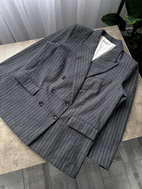 Оверсайз двобортний блейзер H&M В складі 23% wool ✔️ Якість ✔️ З підкладкою ✔️ КОЛІР: Темно-сірий, у тонку смужку Стан ідеальний, бірки зрізані Розмір: Параметри пів обхват: Груди: 62-64 см Талія: 60-62 см Стегна: 62-64 см Довжина: 80 см Плечі: 47 см Рукав: 74 см від горла (61,5 см) Біцепс: 21 см