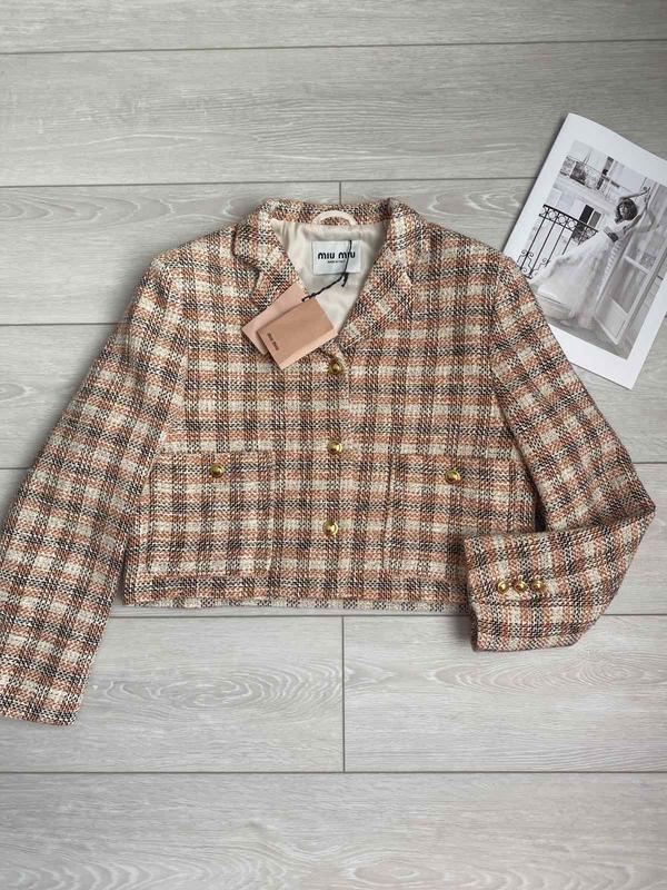 Твидовый жакет в оранжевую и белую клетку с золотистыми пуговицами