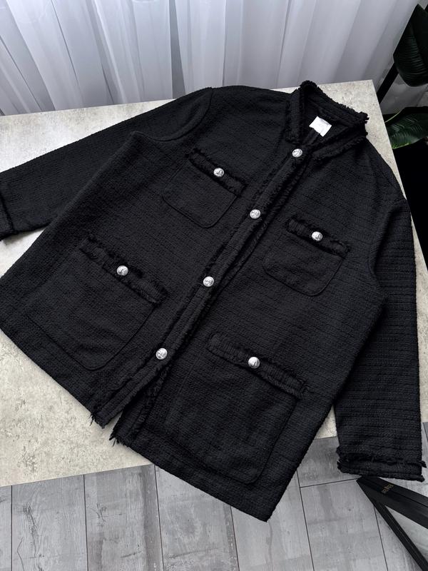 Напівпальто з текстурної тканини зі строкатими зрізами. Модель прямого крою з нагрудними кишенями та передніми кишенями на металевих гудзиках. Вільна посадка зі злегка заниженою лінією плеча та великі металеві гудзики спереду. Без підкладки. Колір чорний Візерунок. Склад.54% поліестер, 46% бавовна Сезонність.Демісезон (весна/осінь) Стан ідеальний Розмір: L можна XL Параметри пів обхват: Груди: 65 см Талія: 65 см Стегна: 66 см Довжина: 80 см Плечі: 48 см Рукав: 54 см від горла 72 см Біцепс: 20 см