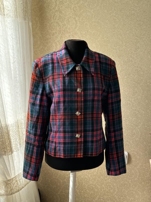 Шерстяний жакет в клітинку, розмір XL На ґудзиках, без кишень. Приталений. З підплічниками та підкладом. 100% шерсть. Вживу поєднання кольорів виглядає неймовірно гарно. Заміри: Півобхват під пахвами - 53 Півобхват талії - 47 Півобхват низу - 53 Довжина по спинці - 55 Довжина рукава по зовнішньому краю - 60 Стан ідеальний, без нюансів
