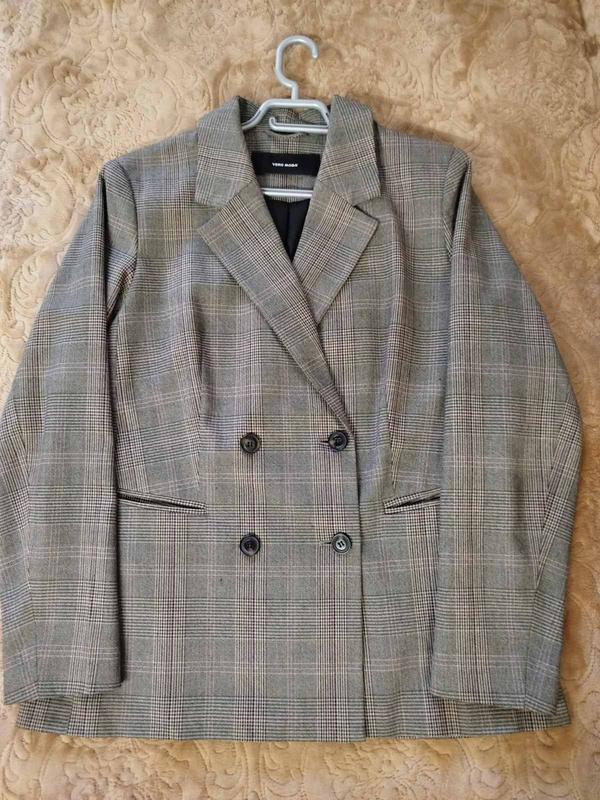 Жакет в клітинку в гарному стані, бірка зі складом зрізана, але тактильно тканина приємна, на підкладці. НОГ 50 см, НОТ 47 см, довжина 74 см, довжина рукава 61 см.