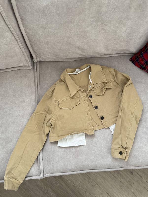 Вкорочений жакет з деніму з білими акцентними кишенями Розмір на ХС Довжина 32 см Рукав 56 см Вживаний, стан ідеальний, без дефектів