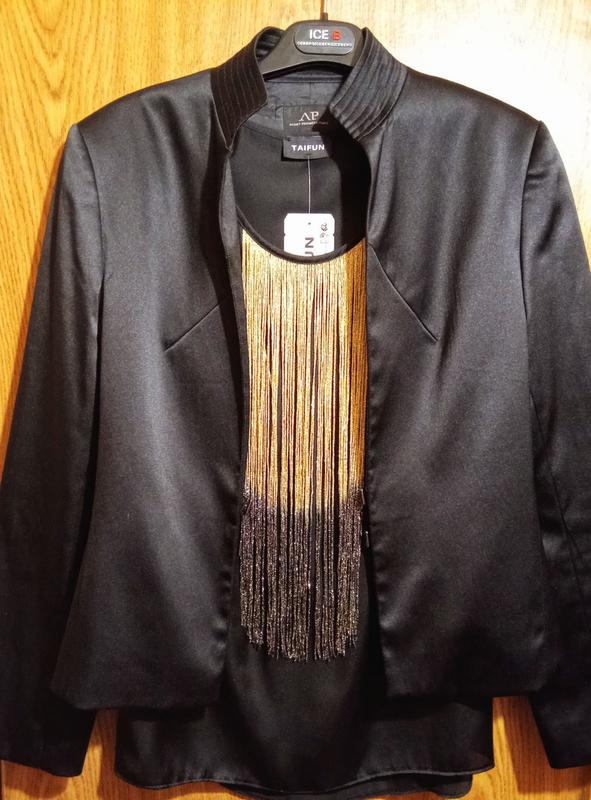 шикарный атласный /полиамид,полиэстер,эластан/ черный жакет на подкладке,с небольшими подплечниками,на талии две металлические застёжки,супер стильный,четкие линии кроя,состояние нового,по бокам имеются петли для пояса или пояска,продается без блузы,блуза только для фото ,размер 38,ориентируйтесь по замерам ширина плеча 43-44 пог 46 пот 42 поб 44 длина рукава 60 длина 58 оплата на карту приват или наложенный платеж по предоплате на доставку
