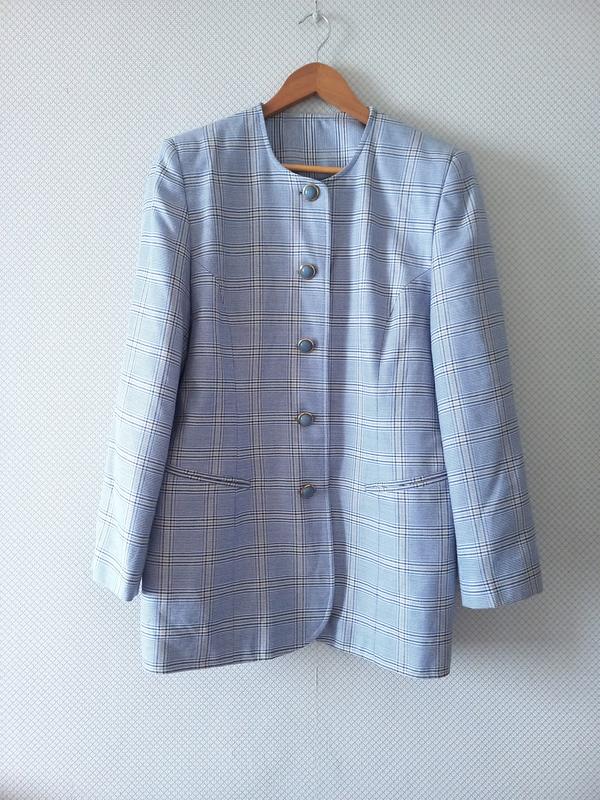 Жіночий блакитний подовжений жакет в клітинку. Виготовлений з якісної бавовняної тканини. Має круглу горловину без коміра, кишені, підкладу. Стан ідеальний. Розмір по бірці 16.