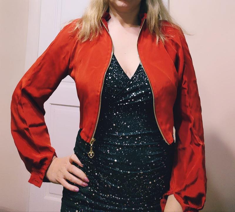 Червоний легкий укорочений жакет (по типу бомбера) від бренду The Fold. Має крій укороченої блузки, манжети на рукавах з гудзиками як на блузці. Колір насичений червоний. Присутня золотиста блискавка спереду. Відмінною рисою є декоративні рюші по лінії коміра та на манжетах рукавів. Тканина складається зі 100% шовку. Внутрішня частина жакету має підкладку того ж або схожого червоного кольору. The Fold London — це британський бренд розкішного жіночого одягу, який спеціалізується на сучасному та елегантному одязі для амбітних жінок. Бірки з розміром не зберіглося, але, орієнтуючись на фактичні заміри, підійде на розміри XS/S. Довжина 38,5 см. НОГрудей - 45 см. Напівобхват по низу -34 см. Довжина рукава від горловини 63 см.(фасон реглан). Стиль бренду тяжіє до вишуканості, що дозволяє носити такі речі не тільки в повсякденному житті, але й, можливо, як елемент менш формального офісного гардеробу. Яскравий червоний колір робить жакет помітним акцентом, який легко поєднувати як з джинсами, так і з класичними шортами чи штанами. Жакет має ідеальний стан, дефектів не виявлено.