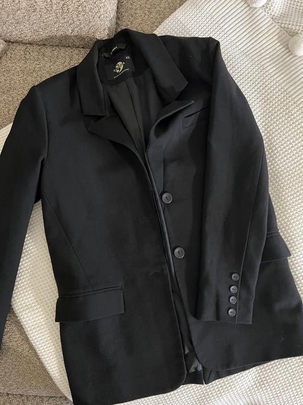Стильний жіночий піджак чорного кольору — універсальна базова річ для гардероба. Лаконічний крій створює акуратний силует та легко вписується як у ділові, так і в повсякденні образи. Піджак добре тримає форму, комфортний у носінні та легко поєднується з брюками, джинсами, спідницями або сукнями. Ідеальний вибір для офісу, зустрічей або стильних міських образів. Характеристики: Тип: піджак Матеріал: віскоза Колір: чорний Застібка: ґудзики Фурнітура: мінімалістична Стиль: classic / casual Посадка: комфортна Розмір: S Обхват грудей: ~84–88 см Обхват талії: ~66–70 см Обхват стегон: ~90–94 см Довжина виробу по спинці: ~68–72 см Довжина рукава від плеча: ~58–60 см