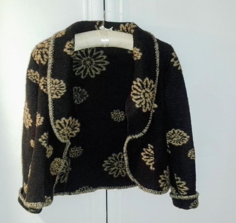 Итальянский брендовый жакетик из шерсти. Выполнен в качестве ручной работы в ретро стиле. Очень плотный, шерсть взбита, напоминает тоненьенький натуральный валенок. Сшитый по фигуре, застегивается на одной кнопке, которую можно пережить по своей фигуре. На бірці р.М. Замеры: Полуобхват груди 48см, тянется до 52см Полуобхват талии 42см, можно менять, перешлив кнопку Полуобхват бедер 50см, тянется до 54см Длина изделия 56см Ширина плеч сзади 41см, тянется до 46см Длина рукава 62см, можно уменьшить заворотом Бутылочка, дырочек нет. Состав: 80% шерсть, 20% полипмид.