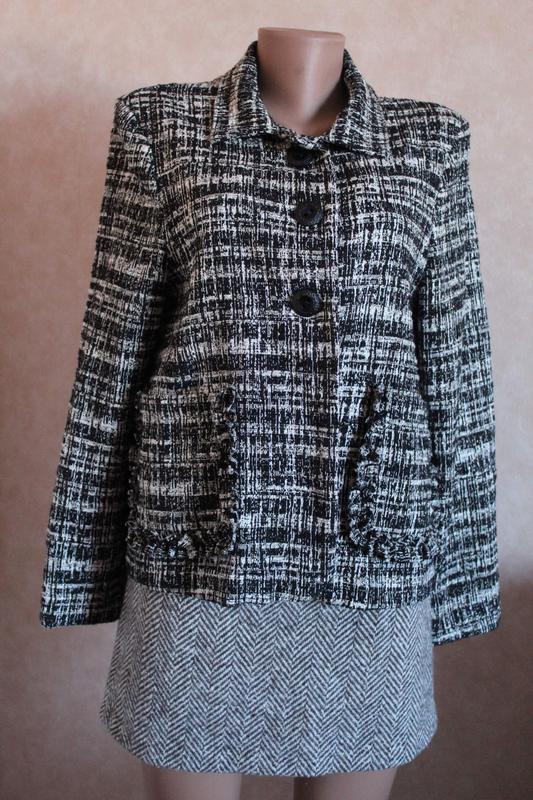 Бренд :. Gambi Milano Размер Л Пиджак нереально красивый, черно белый с вкрааплением золотистого люрекса. Выглядит дорого и элегантно. Размер Л, подойдёт и на М, вещь не обязательно носить впритык) Длина-62 Рукав-60 Пог-51 Пот-52 Плечи-41-42