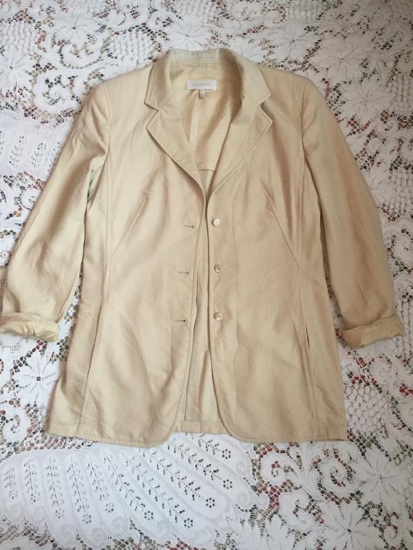 Приталений, подовжений жакет пісочного кольору. Розмір 38, довжина 72см, плечі 40, рукав 58, ПОГ 50