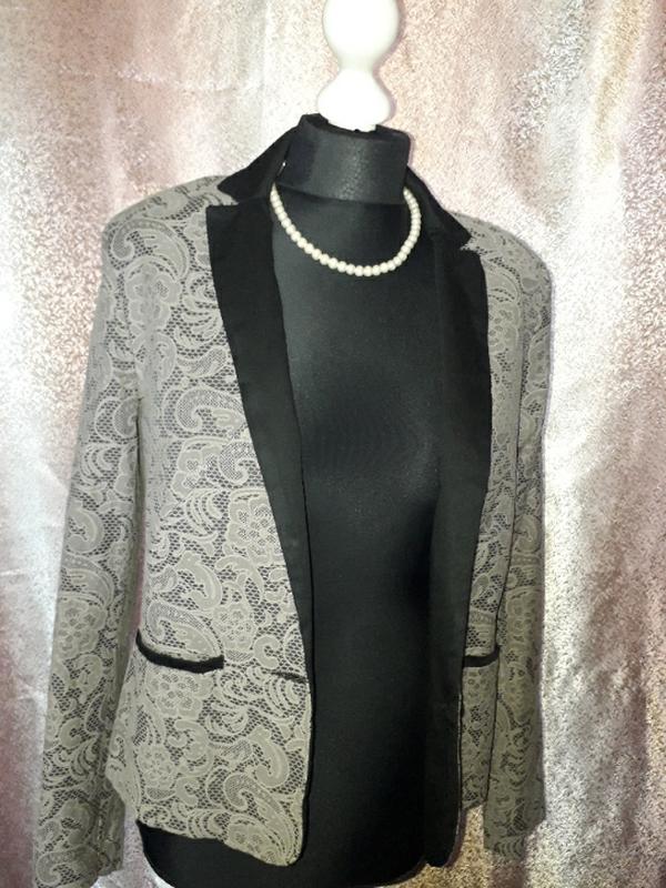стильний напівприталений жіночий жакет, тканини з імітацією мережива. підійде до спідниці, штанів в класичному та діловому стилі. довжина виробу по спинці 54 см, довжина рукава 62 см, ширина в талії 88 див. зроблено в Румунії.