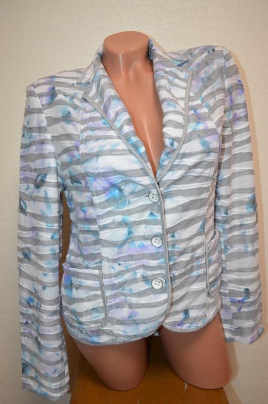 Світлий,ошатний піджак, жакет для шикарної, стильною,ділової леді. Бренд Gelco.Розмір євро 12, заміри по факту:груди 92-96см,талія до 86см,низ до 100см, довжина 56см, довжина рукава від плеча 60см, стан відмінний.Тканина стрейч, бирки зі складом немає