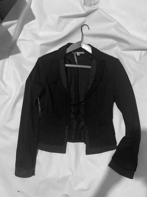 Приталенный пиджак с отделкой в полоску 97% хлопок, хорошее состояние Подкладка 100% полиэстер Размер М/38, но сидит больше как S Длина -48см Подмышка от подмышки -42см Талия -36см Рукав -64см