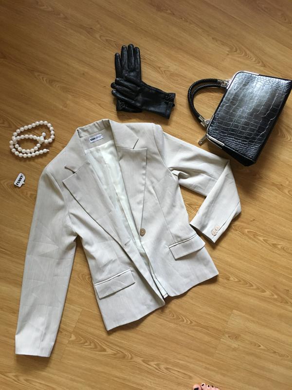 Класичний світло бежевий жакет. Бірка з розміром і складом зрізана, розмір S - M, будь ласка орієнтуйтеся по замірах. Склад - поліестер , дуже добре тримає форму. Плечі - 40 см; Груди - 43 см, Талія - 39 см; знизу - 46 см; Рукав - 62 див. Ідеальний варіант для офісу.