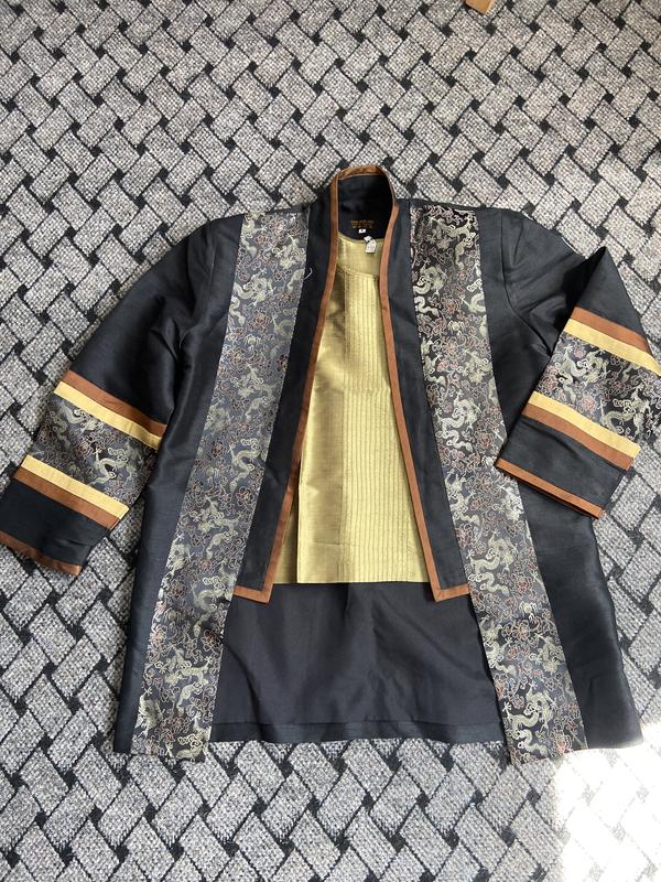 💯 % шовк і жакет і блуза!!! Подовжений Жакет, є подплеснет. Виміри: по плечах-45, пог-55, пот-55, співаю-56, рукав-59,, довжина-82; Блуза: по плечах-36,пог-53, піт -53, співаю-58 ( з боків розрізи по 11см , довжина-56см. Жакет размерL, блуза розмір М.