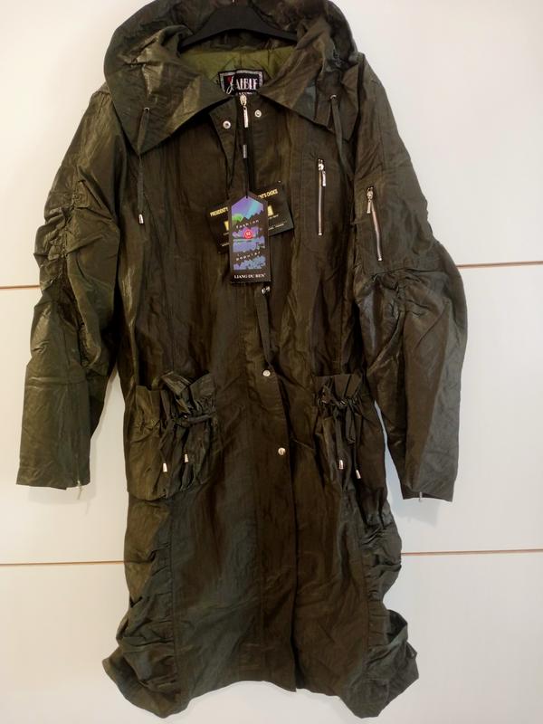 Плащ новий, Китай. На підкладці силует злегка приталений з поясом. Капюшон вкладається у комір, попереду застібка на змійці та на кнопках. Кишені з куліскою, є вертикальні кишені на змійках, рукави з драпіруванням і низ рукави зі змійкою. Тканина м'яка, водовідштовхувальна. Розмір беж і хакі 52, чорний 56. - Виміри: 52, беж: ПОГ62, ПОТ57, ПОБ66, ДР66, Д110 52, хакі: ПОГ62, ПОТ57, ПОБ66, ДР66, Д110 56, чорний: ПОГ68, ПОТ67, ПОБ75, ДР66, Д110