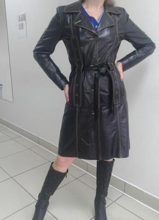 Шкіряний жіночий плащ, стильний, добре сидить на фігурі. Плащ майже не носили, в ідеальному стані. Утеплена підкладка на синтепоні. Довжина виробу - 98 див., довжина рукава - 66 див. ПОГ-48 див. Дівчина на якій плащ травні обхват грудей 100 см, зріст 174 див. Відправка по Україні