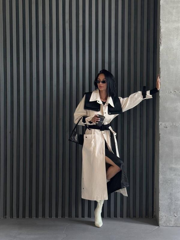 Тренч «Weekend» Стильный комбинированный тренч, из 100% коттона, ремни из основной ткани на кожаной основе. За счет рабочих кнопок можно регулировать высоту разреза Замеры: ОГ - 120 см Стегна - 130 см Рукав с плечом - 75 см Длина - 120 см ✔️Параметры модели: 85/65/90 Рост 167 см