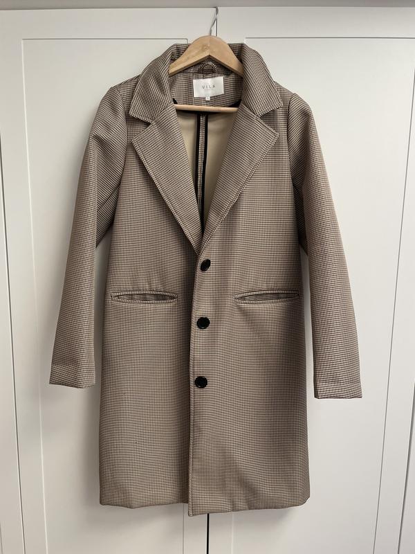 Легкий плащ на осінь без підкладки. Принт маленька гусяча лапка. З однієї сторони збоку є легенька темна полоска, яку при носці не дуже помітно через принт. Ідеально підійде на розмір 36-38.