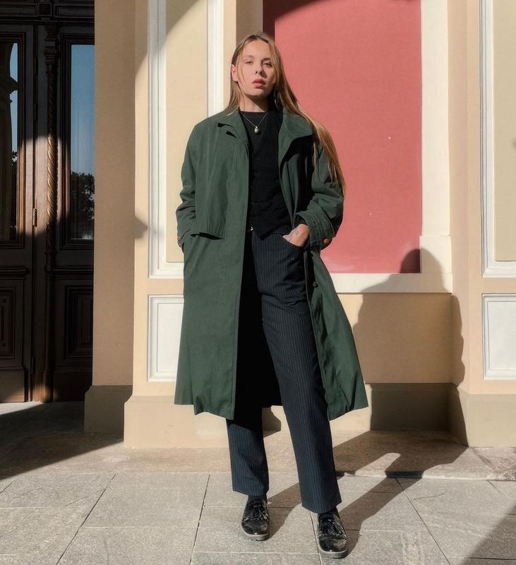 Неймовірний вінтажний плащ 1980-х років у темно-зеленому кольорі від Delmod⚜️ Має теплу підкладку, ідеально підійде на жовтень, листопад, початок грудня. Верх підкладки з шерсті, низ з тканини-хамелеона, гарно переливається на сонечку. Добре захищає від вітру. Основні ґудзики пластикові, а біля вороту - шкіряні. Такі ж є на рукавчиках і 1 на спині. Воріт піднімається і захищає шию від вітру. Є внутрішня кишеня. Тканина Верх - поліестр та котон Підкладка - віскоза, шерсть та ацетат Загальна довжина - 121 см Довжина рукава - 54 см Плечі - 53 см Напівобхват груди - 60 см Напівобхват талія - 66 см Розмір універсальний, добре сидітиме на L На фото приклад як сидить на М, оверсайз Стан хороший, вживаний, але без дефектів