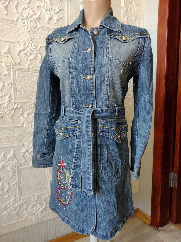 Джинсове пальто плащ. Без підкладки. Розмір вказаний англ.12, що відповідає нашому 46, але краще підійде на 44. Заміри на фото. Манекен 46 розміру. З нюансос — потертість у зоні грудей.