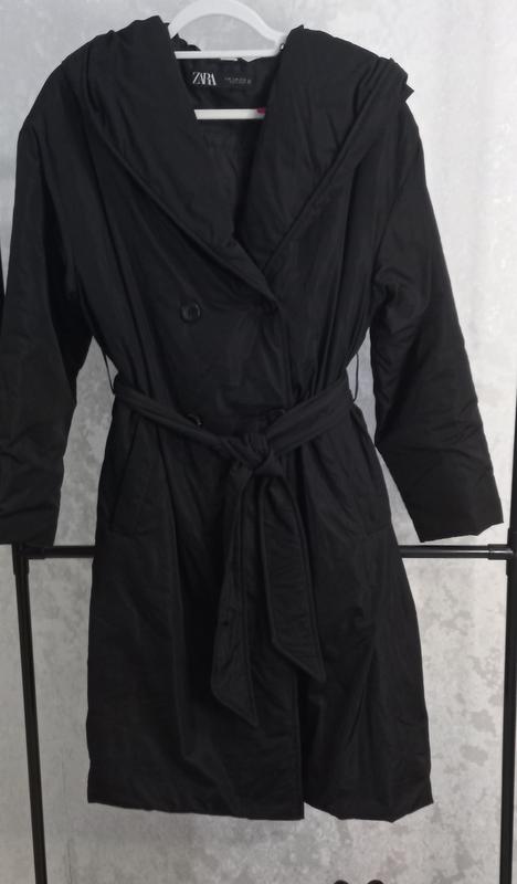На зображенні представлене жіноче демісезонне пальто (тренч) чорного кольору від бренду ZARA. Дизайн: Подовжений крій з капюшоном та широкими лацканами. Деталі: Виріб доповнений поясом у тон, який підкреслює талію, та застібається на гудзики (двобортна модель). Матеріал: Тканина типу «плащівка», часто з водовідштовхуючими властивостями. Утеплювач: У подібних моделях як наповнювач може використовуватися тонкий шар синтепона. Розмір М 1500 гр