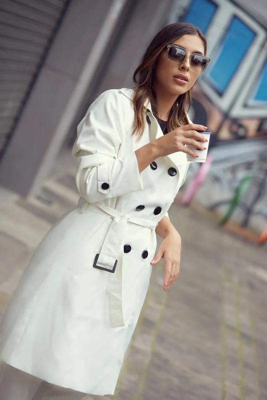 женский двубортный тренч молочно-белого цвета выполнен в классическом стиле с поясом. Размер 48-50