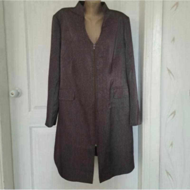 Дуже класний плащ для жінки. Тканина з домішками світлішого відтінку, не мнеться, костюмна з лавсаном. Зовні кишені обманки, є дві внутрішні кишені. Гарний виріз під водолазку або светр. Ззаду шліц. Колір темно-коричневий із відливом. Стан нового. Розмір 54-56 Дивіться заміри: Довжина по спинці — 100 см. Плечі по-спінці — 43 см. ПОГ-6О см. НОТ — 56 см. НОС — 63 см. Плече-12 см. Рукав — 63 см.
