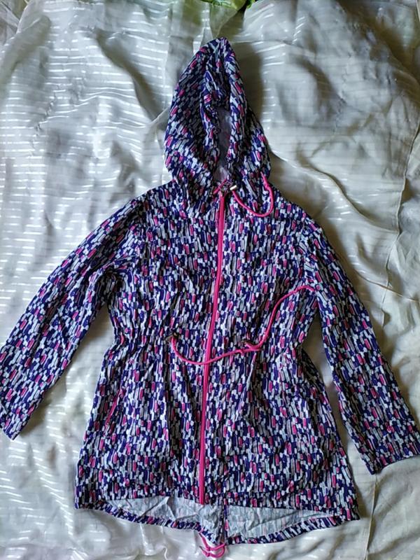 Стильная и яркая плащ -ветровка с капюшоном .Указан размер М , но можно носить и L - 46 и XL - 48 , смотрите замеры плеч . Длина спереди 75 см .Длина сзади до шнурочков 85 см .Плечи 40 - 42 см . От подмышки до подмышки 54 см . Смотрите замеры , главное чтобы села в плечах , талия регулируется за счёт шнурка . Рукав от плечевого шва 62 см . можно укорачивать за счёт кнопки. Есть два кармана на змейках. Очень легёнькая . ОБ 64 см .За счёт рисунка не видно если даже и не гладить . Смотрите по плечам . Перешлю новой почтой. Доставка за счёт покупателя . С безопасной оплатой не работаю.