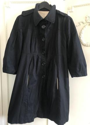 Стильний плащик з укорочені рукавом. Італія, розмір -М. Колір-чорний, підкладка-беж.Склад:Бавовна-100/. Відрізне під грудьми, форма-кокон. , застібка на великі гудзики. Дві кишені{в одній кишені трохи распоролся шов-треба просто акуратно зашити}. Дуже стильний. Заміри:довжина-88 см, ПОГ-46 см, ПОБІДИ -54 см, рукав-3/4
