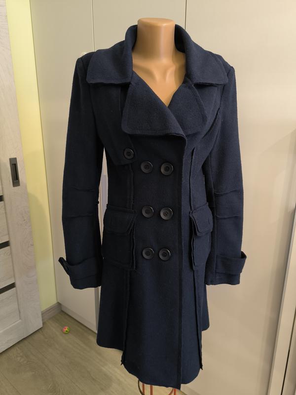 Плащ темно-синего цвета, двубортный. Длина 87, рукав 63, плечи 42, пог 43, поб. 44. Без дефектов.
