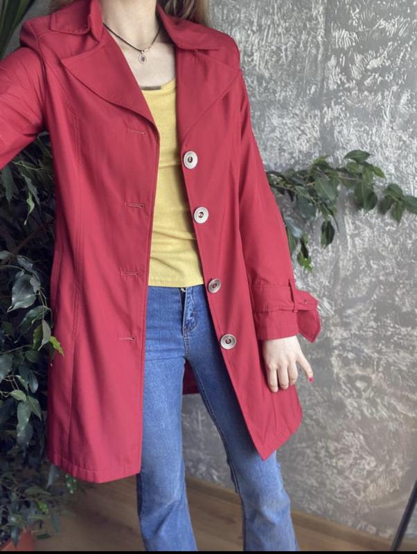 Червоний плащ класичного крою. Подвійний, з підкладкою, також підкладка на плечах. На одному з рукавів відсутній ґудзик. Підходить на будь-яку фігуру.