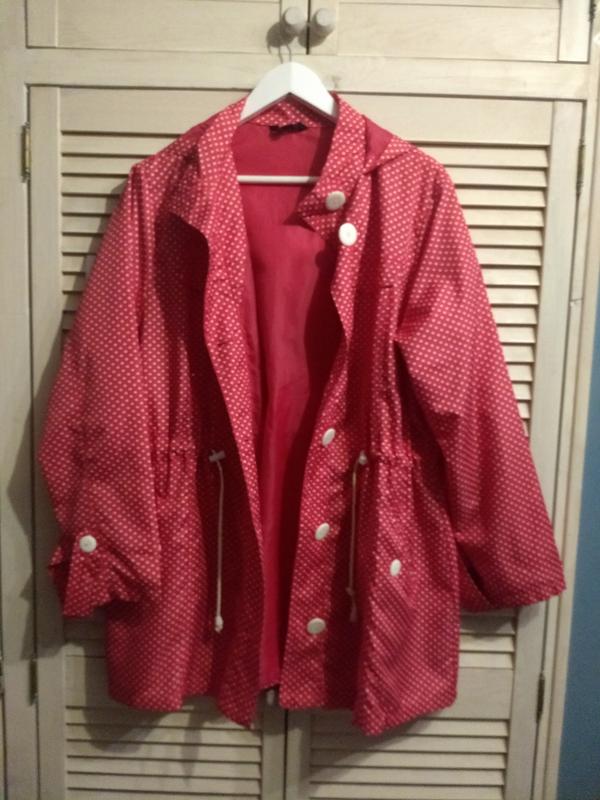 Плащ тоненький , легкий, на підкладці, в ідеальному стані, є нюанс з кріпленням шнурка.. дитина погриз. На фото видно