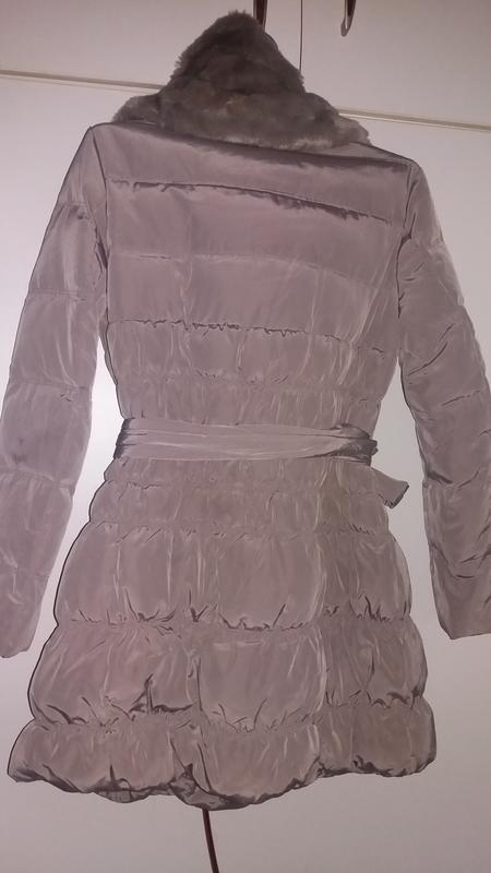 Пухове пальто світлого пастельного кольору, на комірі пристібається на гудзиках штучне хутро. Додаткові заміри: рукав 60см, плечі 4см, довжина по спинці 80см, ПОТ -41см, ПОБІДИ 50см, трохи тягнеться так як шви прорезиненыюСкорее всього М