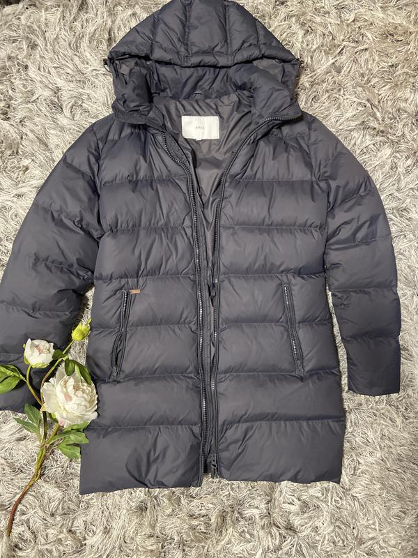Зимовий, теплий, добре набитий пуховик. Капюшон відстібається, кишені на блискавці, всередині куліска, двосторонній замок. 80%-пух,20%-перо. На рукавах манжети задувати не буде. Виміри: пог-63, пот-55, поб-64, рукав-68, довжин-91. Фото 5 - була трохи надірвана кишеня: акуратно зашито і зверху прижита залізна фурнітура. Без цього нюансу стан ідеальний. Тканина зверху плащевка. Колір-мокрий асфальт.
