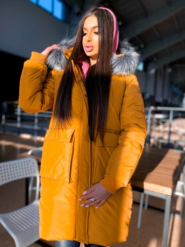 Колір червоний, гірчиця. Тканина: плащівка +нейлонова підкладка + хутро штучне (знімний) Наповнювач: силікон 250 Розмір 42-44 42(S): ОГ 78-82, ВІД 58-62, ПРО 86-90 див. 44(M): ОГ 86-90, ВІД 66-70, ПРО 94-98 див. 00717