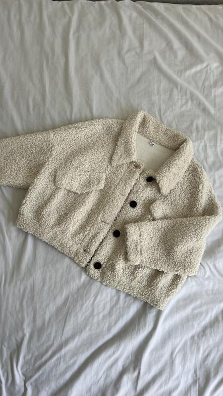 Стильна вкорочена шубка з хутра під овчину має дві кишені, та підклад з замші ґудзики коричневого кольору стан чудовий