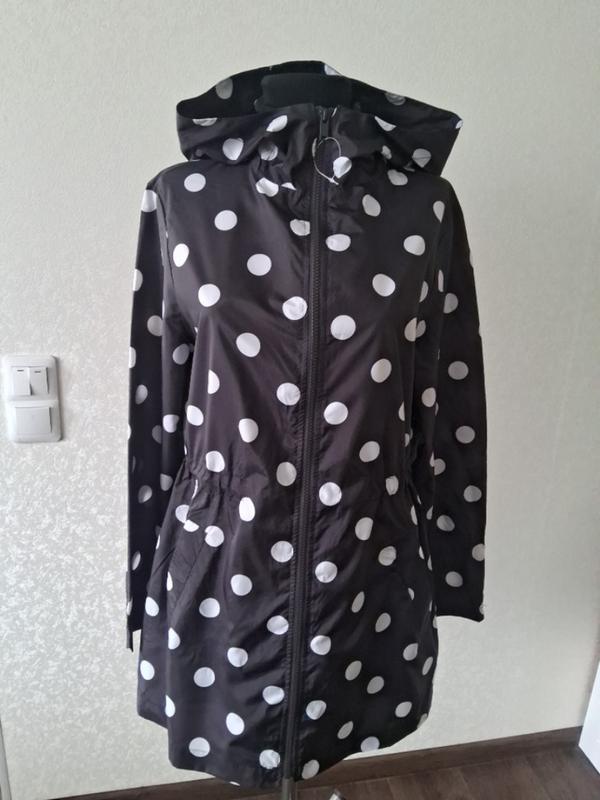 третя одиниця в подарунок ( при оплаті на картку) будь ласка, задавайте питання-перед замовленням Красива якісна легка вітровка New Look р.42-44 стан нової речі, з пломбою/ упакована колір: чорний шоколад ( темно- коричневий)+ білий горошок без дефектів Пог 52, довжина 74, рукав 60 без підкладки з кишенями талія коригується-фіксаторами ( 6 фото) матеріал- легкий ( тепла весна-осінь, літо) тканина- плащівка поліестр ( не дощовик) оплата на карту Приватбанку повернення немає