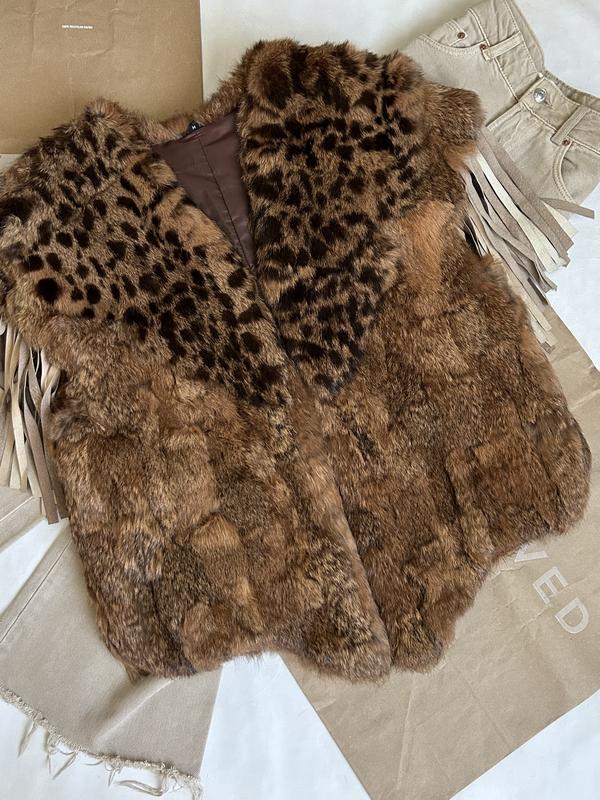 Розкішний жилет із хутра шиншилового кролика. Якість, крій та поєднання кольорів просто супер. Є кишені, застібка шубні крючки. Цікавий елемент бахрома із натуральної шкіри. Хутро чудової якості, м‘яке та ніжне на дотик. Стан ідеал!