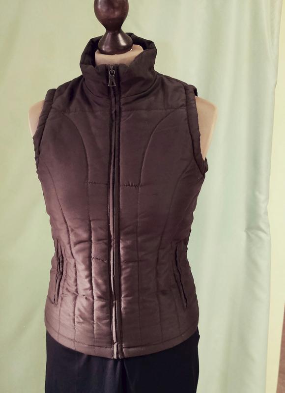 Очень стильная безрукавка с красивой вертикальной простежкой, на тонком синтепоне, 2 кармана ( еще зашиты), застегивается на крупную пластмассовую молнию. Приталена, ткань полиестр без пропитки от дождя. ТКАНЬ: полиестр РАЗМЕР: 34/XS СОСТОЯНИЕ: отличное ЦЕНА: 250 грн. ДИ = 54 см ПОГ = 43 см ПОТ = 41 см ПОБ= 44