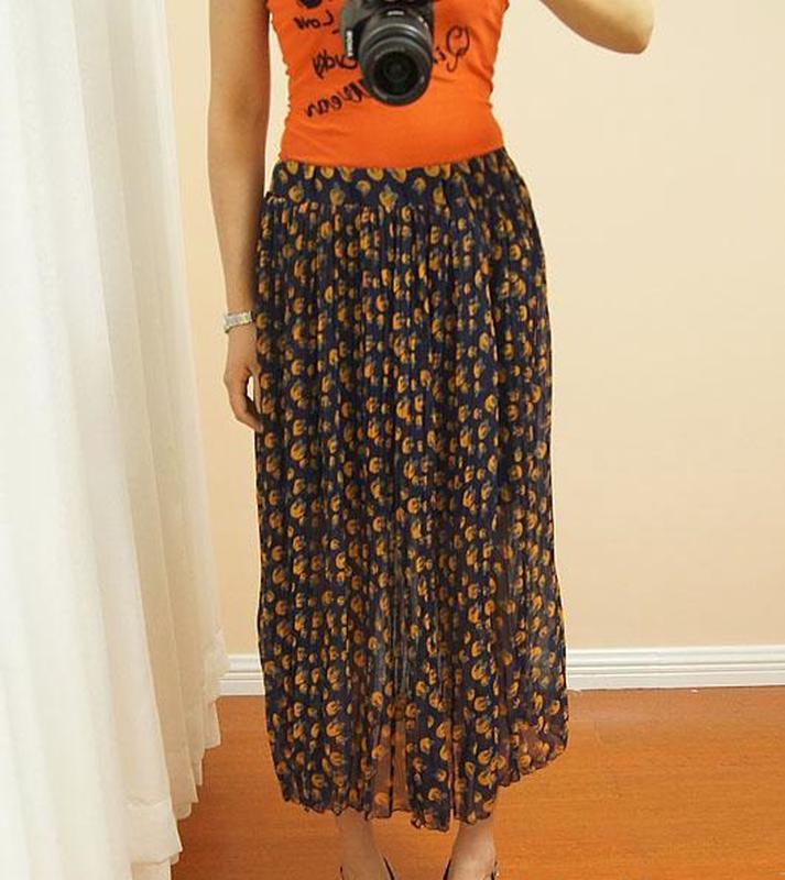 Гофрована спідниця темносинего кольору з помаранчевими кульками-бантиками, висока талії, тканина не тягнеться, не мнеться, просвічується, де немає подъюбника, є під'юбник. Заміри: напівобхват талії 32 см ( гумка, максимально тягнеться до 45 см), напівобхват стегон 80 см, довжина 77 см, ширина по низу 110 див. Підійде на розміри за європейською сітці 36,38,40.