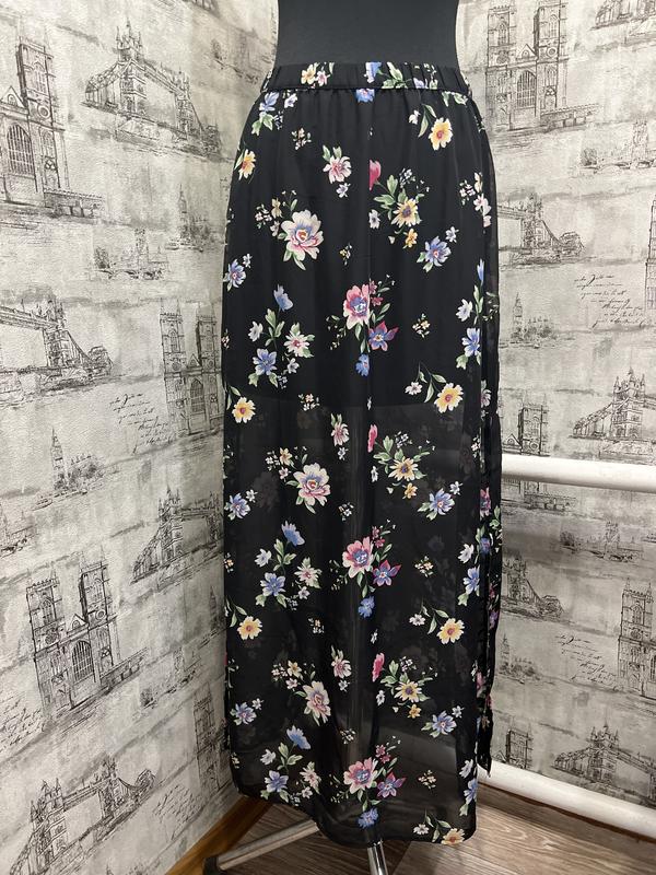 Чорна в квітах довга спідниця з розрізами по бокам та підкладом
