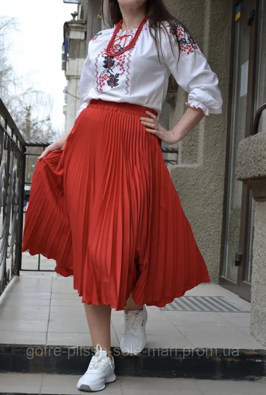Гарна спідниця довга червона гофре м 10 Довжина 78 Напівобхват талії 35 збоку блискавка Не просвічується Поліестер
