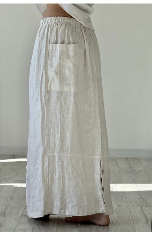 Юбка спідниця льон, дуже гарна та крута, стильна, незвичне поєднання простоти та розкоші. Має два розрізи, спереду та позаду, останній застібається на ґудзики, великий карман позаду, який придає незвичного крою моделі. Зріст дівчини на фото 165, вага до 60 кг. Вказано розмір М, та може бути на S та L. Льон плотний, необроблений, не світиться, колір слонової кістки. Фото не передає красу цієї спідниці.