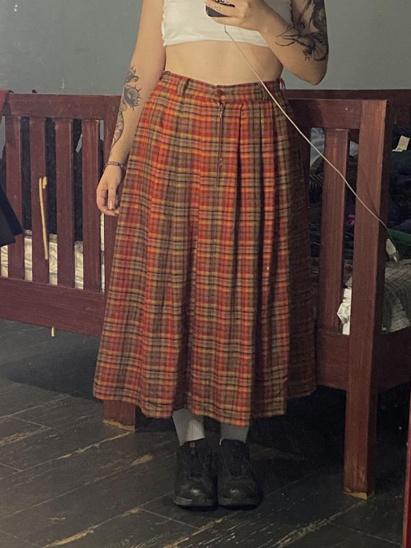 довга картата спідниця оранжевого кольору на підкладці є дірка, при носці не заважає розмір С-М