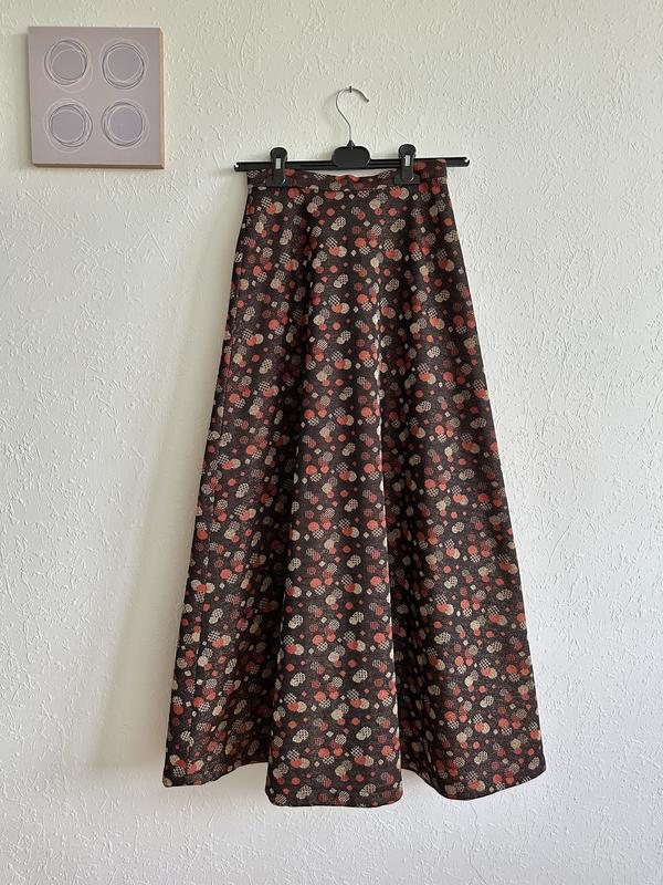 Витончена довга спідниця А-силуету з щільної тканини з блискучою ниткою. Темно-коричнева основа прикрашена абстрактним візерунком у червоно-бежевих тонах. Тканина має легкий металічний відблиск, гарно тримає форму та не просвічує. Елегантний варіант для осені, свят чи вечірніх виходів. Розмір: орієнтовно XS–S (талія ≈ 60 см, довжина ≈ 92 см) Матеріал: поліестер із люрексовою ниткою Стан: відмінний, без дефектів