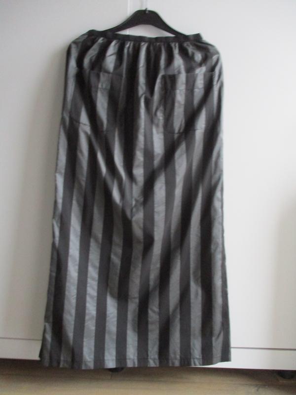 Довжина 95 см півобхват поясу 36 см півобхват бедер 55 см дві кишені звичайні Колір чорний з сірим тканина - 64% поліестер, 36% шовк Нова з етикеткою