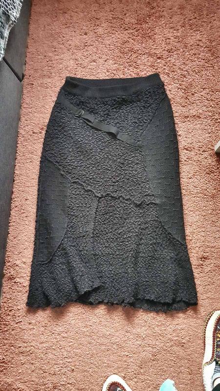 Вязана трикотажна спідниця букле з атласною підкладкою.Дуже тепла в гарному б/у стані.без дефектів.Пояс на резинці.Колір чорний.Розмір 48-50 Заміри:довжина-79,талія-38,бедра-50(гарно тягнеться)