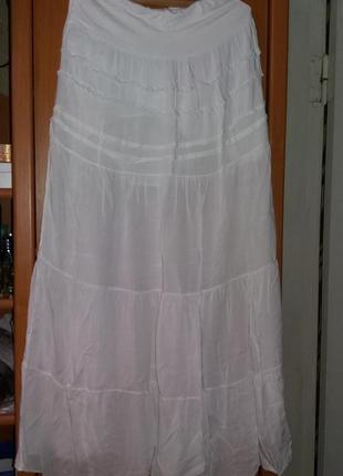 Шикарна невагома Італійська спідниця в ідеальному стані. Трикотажна кокетка тягнеться тому можна носити від 46 розміру по 50 розмір. Є петельки для пояса. Спідниця з коротким нижніх спідниць, теж тонкий і натуральний. З цією спідницею вам не страшна літня спека.