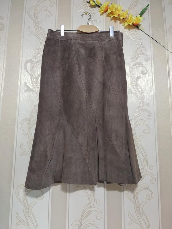 Спідниця шикарна, скроєна по косій, довга з клинами , які ефектно виглядають при ходьбі, колір насичений , кави з молоком, спідниця на підкладці, на дотик тканина замша приємна і м'яка, стан відмінний без нюансів нове, без паперової бирки, пояс зсередини застібається на гудзик і потаємну блискавку. заміри: довжина-79 см, ПОТ 42-43см, ПОБ 51-52см, виглядає елегантно. Вдалих Вам покупок !