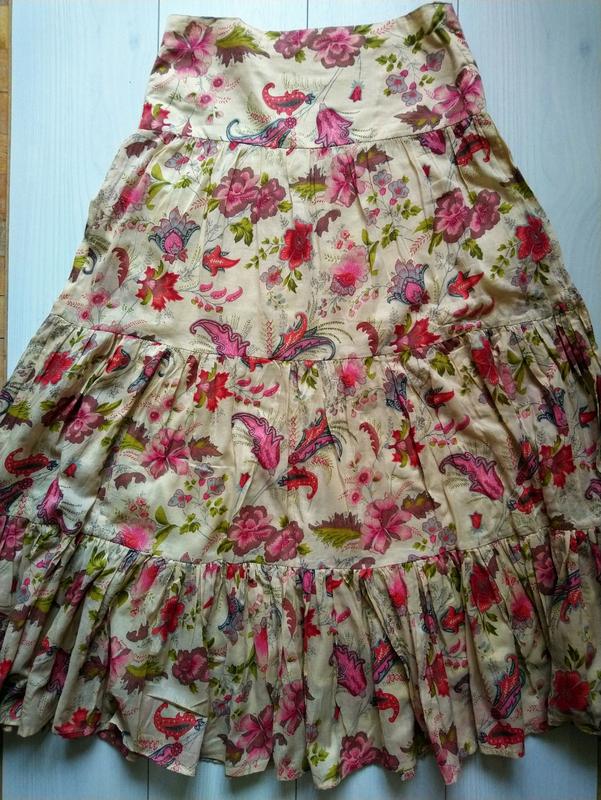 Спідниця довга в дуже хорошому стані Матеріал котон тоненький З підкладкою З боку на замочку Довжина 94 см Півобсяг пояса 36-37 см Обрізана етикетка